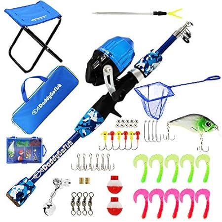 DaddyGoFish Kids Fishing Pole – Telescopic Rod & Reel Combo with Collapsible Chair, Rod Holder, Tackle Box, Bait Net and Carry Bag for Boys and Girls