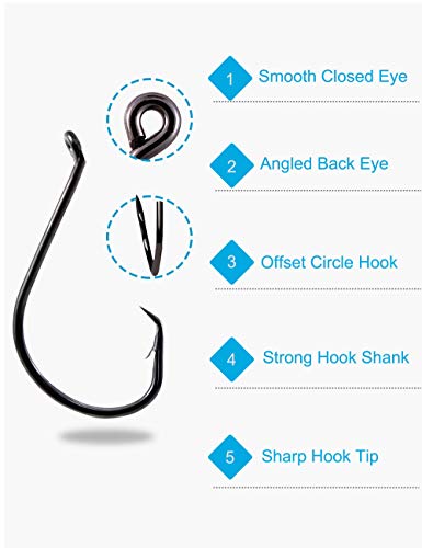 Catch and Release Hook: Offset circle hooks designed for hooking the fish in the corner of mouth or lip, reducing gut hooked fishes. It’s believed to be must-have fishing hooks in your tackle box.