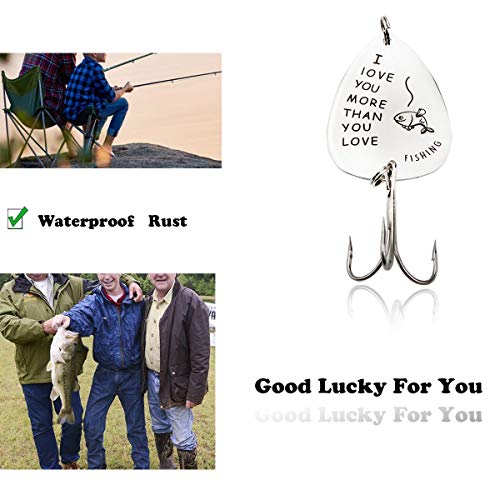 Silver stainless steel personalized engraved fishing hook, engraved with gold words “I LOVE YOU MORE THAN YOU LOVE ME”.